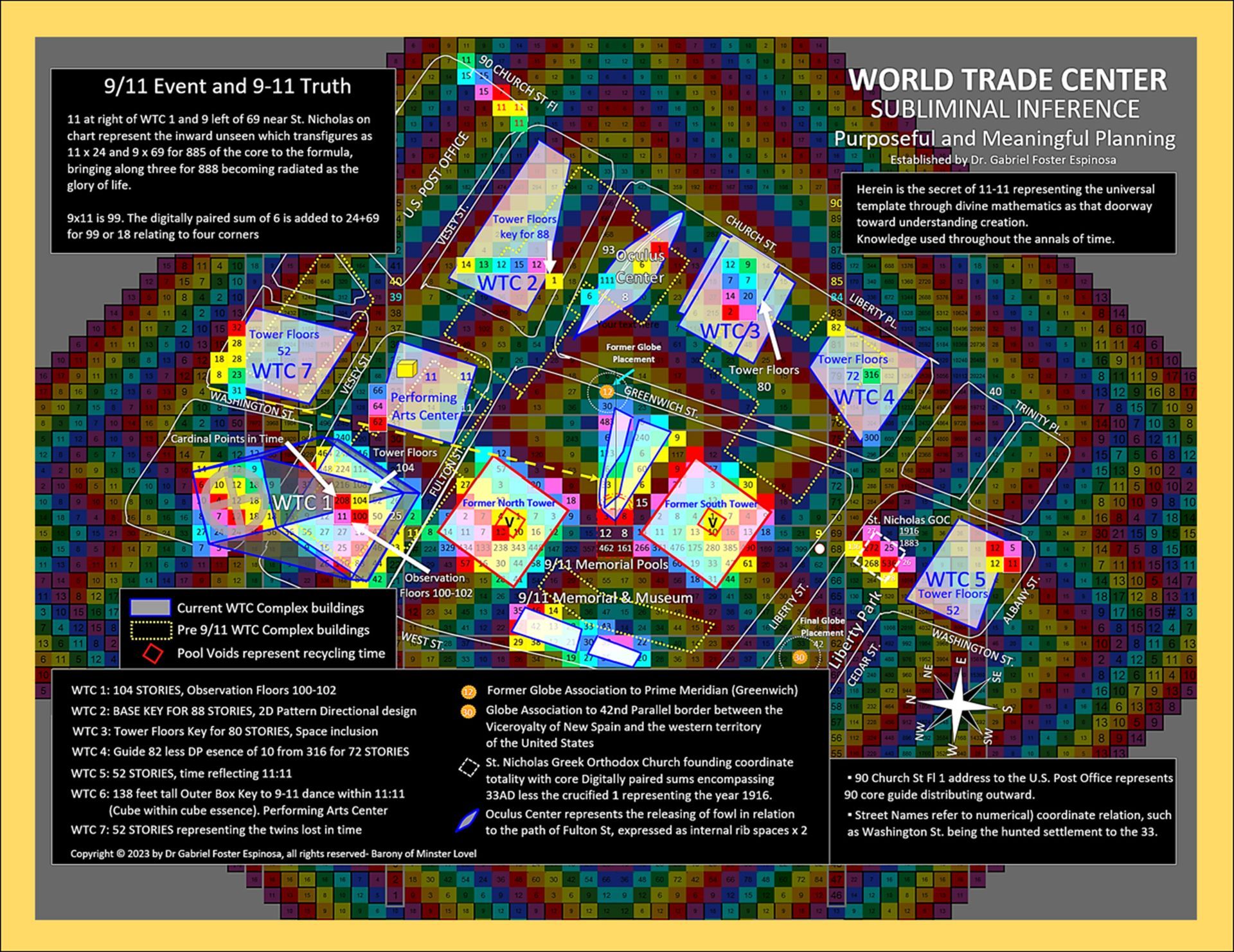 The above chart reveals the underlying motivation to overal planning after the 9/11 event. Street names correspond to numerical association as established of the Divine Mathematical grid. The zero line of longitude here is associated with Greenwich St established by the legend as location of the Koenig Sphere (Globe) which was commissioned in 1966. Each of the Original Twin Towers center coordinated to the horizontal numbers 10 of the Divine Mathematical grid. The number directly above each 10 as 1, harmonically inspired the vertical hight to the towers as 110 stories each. All else were developed to match salient number associations dictating locations, shapes, building height or number of floors to each structure and potential attributes based on their underlying number coordinates.